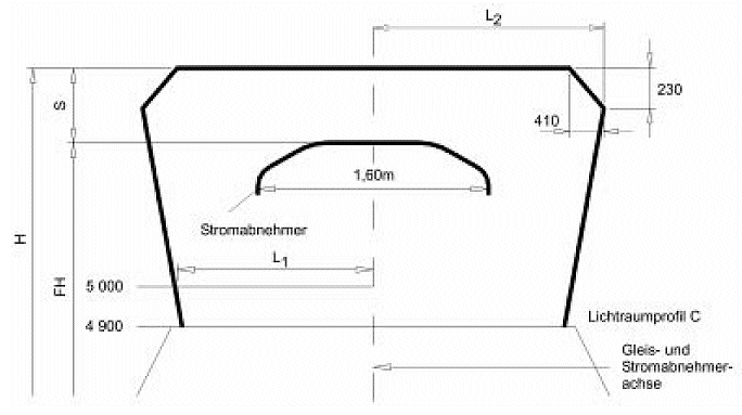 Bild H.6 zeigt die Abmessungen für den notwendigen Durchgangsraum für Euro-Stromabnehmer auf interoperablen Strecken. Zusätzlich zu diesem Raum muss die Infrastruktur den für den Einbau der Oberleitung selbst und die dazu gehörigen Sicherheitsabstände notwendigen Raum beachten. Der Raum hängt von der Ausführung der einzelnen Oberleitung und der zugehörigen elektrischen Spannung ab.