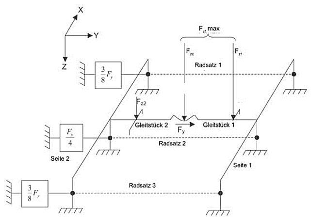 kN (für Drehgestelle mit drei Radsätzen)Hinweis: Die angegebenen Querkräfte für Drehgestelle mit drei Radsätzen basieren auf der Lastverteilung, die bei den Fahrversuchen für die Zulassung des Drehgestelltyps 714 aufgezeichnet wurde. Für andere Drehgestelltypen ist die Lastverteilung anzuwenden, die bei den Fahrversuchen mit der jeweiligen Drehgestellbauart ermittelt werden.