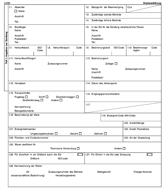 | Mustererklärung für die Einfuhr aus Drittländern in bzw. Durchfuhr durch die Europäische Gemeinschaft von Zwischenerzeugnissen, die zur Verwendung in Medizinprodukten, Invitro-Diagnostika und Laborreagenzien bestimmt sind | Anhang II |