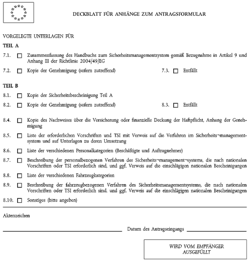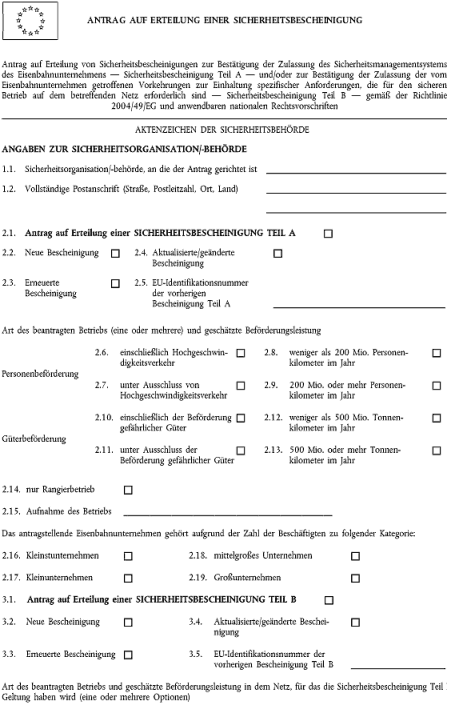 Einführung Dieses Antragsformular ist von Eisenbahnunternehmen ("Antragsteller") zu verwenden, die eine Sicherheitsbescheinigung Teil a und/oder Teil B beantragen (Artikel 10 Absatz 1 der Richtlinie 2004/49/EG). Bezugnahmen in diesem Dokument verweisen, sofern nicht abweichend vermerkt, auf Artikel der Richtlinie 2004/49/EG. Ein Eisenbahnunternehmen kann dieses Antragsformular zur Beantragung einer oder beider Bescheinigungen bei der zuständigen Sicherheitsbehörde/-organisation verwenden. Die Verwendung dieses Formulars ermöglicht es der Behörde, den Antrag zügig innerhalb der in Artikel 12 Absatz 1 festgelegten Frist zu bearbeiten. Das Formular ist vollständig auszufüllen und mit entsprechenden Angaben durch das Eisenbahnunternehmen zu ergänzen. Sicherheitsbescheinigungen Teil a und Teil B Mit diesem Formular kann ein Eisenbahnunternehmen gleichzeitig eine Sicherheitsbescheinigung Teil a und eine Sicherheitsbescheinigung Teil B oder nur eine der beiden Sicherheitsbescheinigungen beantragen. Der Antrag kann eine neue, erneuerte oder aktualisierte/geänderte Sicherheitsbescheinigung Teil a und/oder Teil B (gemäß der Begriffsbestimmung in Artikel 10 Absatz 5) zum Gegenstand haben. Die Beantragung lediglich einer neuen Sicherheitsbescheinigung Teil a und später, mit einem zweiten Antrag, einer ersten Sicherheitsbescheinigung Teil B ist möglich. Wird nur eine Sicherheitsbescheinigung Teil B beantragt, muss der Antragsteller über eine gültige Sicherheitsbescheinigung Teil a verfügen. Art und Umfang des Eisenbahnbetriebs Gemäß Artikel 10 Absatz 5 ist eine Sicherheitsbescheinigung vollständig oder teilweise zu aktualisieren, wenn sich die Art oder der Umfang des Betriebs wesentlich ändert; ebenso hat der Inhaber die zuständige Sicherheitsbehörde unverzüglich über alle wichtigen Änderungen der Bedingungen des einschlägigen Teils der Sicherheitsbescheinigung zu unterrichten. "Art" und "Umfang" des Eisenbahnbetriebs müssen daher der Sicherheitsbehörde bekannt und vom Eisenbahnunternehmen festgestellt sein. "Art" und "Umfang" bilden die Grundlage für die gemeinschaftsweite Gültigkeit der Sicherheitsbescheinigung Teil a und sind der Bezugspunkt für die Bestimmung "gleichwertiger Eisenbahnverkehrsdienste" (Artikel 10 Absatz 3) in der gesamten Gemeinschaft. Die "Art" des Betriebs wird gekennzeichnet durch die Personenbeförderung unter Einschluss oder Ausschluss von Hochgeschwindigkeitsdiensten, Güterbeförderung unter Einschluss oder Ausschluss der Beförderung gefährlicher Güter und ausschließlich Rangierbetrieb. Der "Umfang" des Betriebs und des Eisenbahnunternehmens wird gekennzeichnet durch die Beförderungsleistung im Personen-/Güterverkehr und die überschlägige Größe des Eisenbahnunternehmens hinsichtlich der Zahl der im Eisenbahnbereich tätigen Mitarbeiter (Kleinstunternehmen, Kleinunternehmen, mittelgroßes Unternehmen, Großunternehmen). Bei Sicherheitsbescheinigungen Teil B müssen "Art" und "Umfang" des Betriebs, der von demselben Eisenbahnunternehmen in einem oder mehreren Staaten durchgeführt wird, von "Art" und "Umfang" des Betriebs der Sicherheitsbescheinigung Teil a abgedeckt sein. Alle Angaben in den Feldern [2.6] bis [2.19] und [3.6] bis [3.16] sind für die Feststellung erforderlich, ob der beabsichtigte Betrieb, für den die Sicherheitsbescheinigung beantragt wird, anderen Eisenbahnverkehrsdiensten, die der Antragsteller bereits im Rahmen zuvor erteilter gültiger Sicherheitsbescheinigungen durchführt, gleichwertig ist oder nicht. Zusätzliche Angaben Seite 3 des Antragsformulars dient zur Auflistung der Unterlagen, die dem Antrag beizufügen sind. Sie ist als Checkliste sowohl für den Antragsteller als auch für die ausstellende Organisation/Behörde gedacht und sollte daher als Deckblatt für die Anhänge zum Antragsformular verwendet werden (die Kästchen sind je nach Fall abzuhaken). Alle Felder des Antragsformulars sind nummeriert und werden auf den folgenden Seiten erläutert. Der mit dem Antragsformular der Sicherheitsorganisation/-behörde übermittelte Antrag ist an der dafür vorgesehenen Stelle von einer unterschriftsberechtigten Person zu unterzeichnen. Der Name des Unterzeichners ist ebenfalls anzugeben. Erläuterungen und Ausfüllhinweise 1.1.-1.2. Name und Anschrift der Sicherheitsbehörde/-organisation, an die der Antrag gerichtet ist. Aktuelle Informationen sind unter anderem abrufbar auf der Internetseite der Europäischen Eisenbahnagentur (www.era.eu.int) oder gegebenenfalls auf der Internetseite der zuständigen Sicherheitsorganisation/-behörde. 2.1. Dieses Feld ist anzukreuzen, wenn eine Sicherheitsbescheinigung Teil a beantragt wird. In diesem Fall ist durch Ankreuzen der folgenden Kästchen zusätzlich anzugeben, um welche Art und welchen Umfang des Eisenbahnbetriebs es sich handelt. 2.2. Dieses Kästchen ist in folgenden Fällen anzukreuzen: