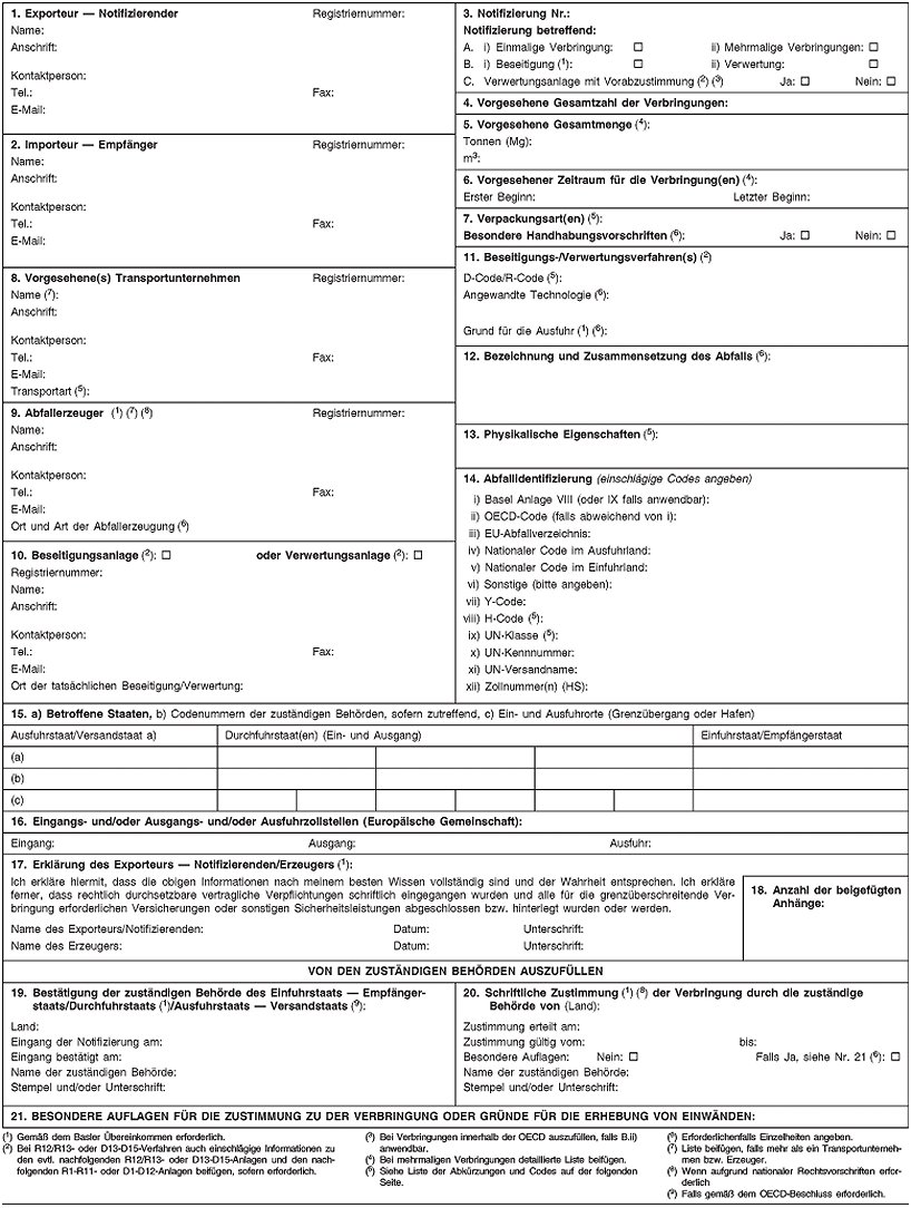 Notifizierungsformular für grenzüberschreitende Verbringungen von Abfällen