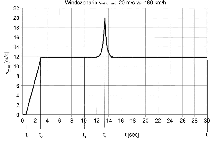 Für das Windszenario ist der folgende zeitliche Verlauf zu berücksichtigen (die Dauer der maximalen Windböe ist t3 = 14 s):
