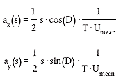 Wenn die Zeitkonstanten bekannt sind, kann der zeitliche Verlauf der dimensionslosen Windschwankungen in Längs- und Querrichtung der mittleren Windrichtung folgend abgeleitet werden. Die dimensionslosen Schwankungen der Windgeschwindigkeit der Komponente u in Längsrichtung ax und in Querrichtung ay können dann als Abstand s des Maximums der Windböe wie folgt ausgedrückt werden: