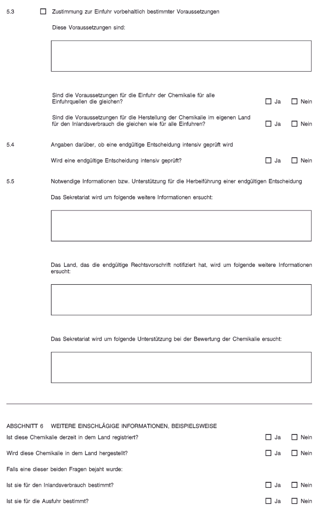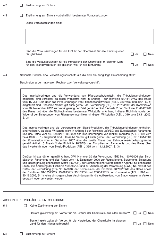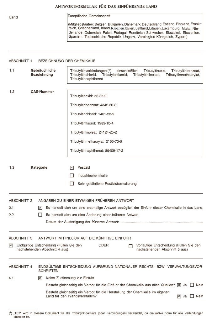 Die endgültige Einfuhrentscheidung für Tributyltinverbindungen wird entsprechend dem im Anhang enthaltenen Antwortformular für das einführende Land erlassen.