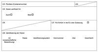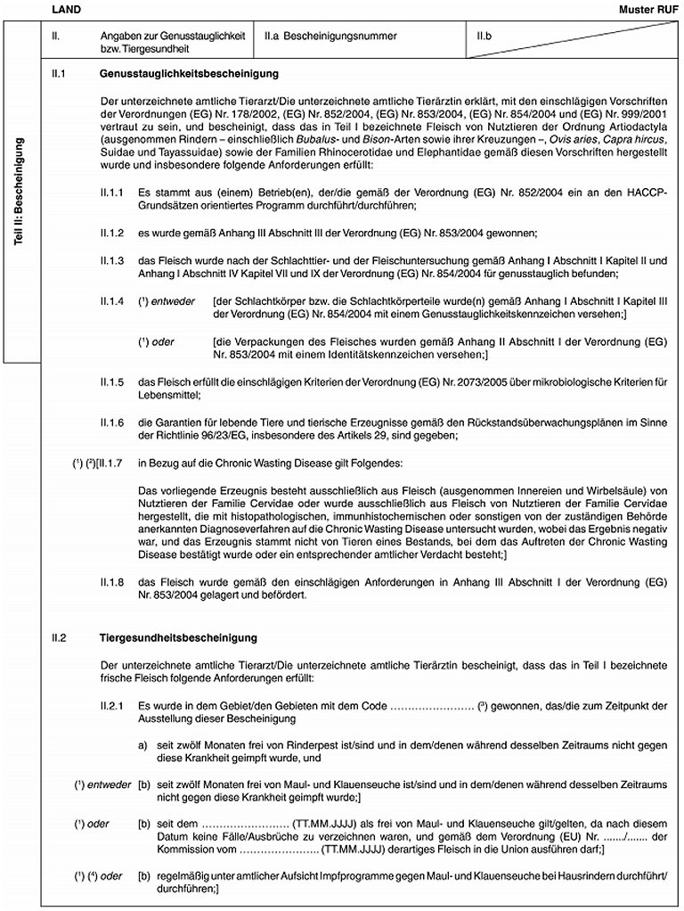 | "G": | Garantien hinsichtlich 1) des Ausschlusses von Innereien und Rückenmark und 2) der Untersuchung und Herkunft von Cervidae im Zusammenhang mit der Chronic Wasting Disease gemäß den Angaben im Muster RUF (Nummer II.1.7.) bzw. RUW (Nummer II.1.8.) |