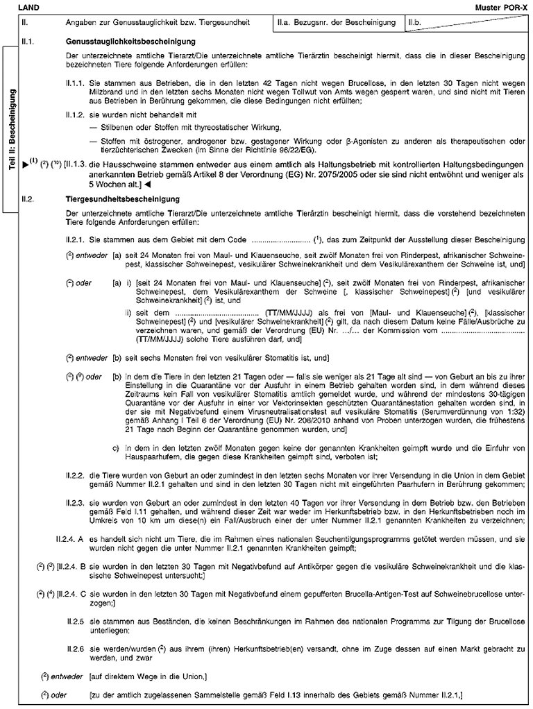 | "D": | Garantien, für die eine Bescheinigung nach dem Muster POR (Nummer II.2.3 Buchstabe d) ausgestellt wurde, hinsichtlich der Spültrankfütterung in dem/den Betrieb(en) mit Tieren, aus denen frisches Fleisch gewonnen wurde |