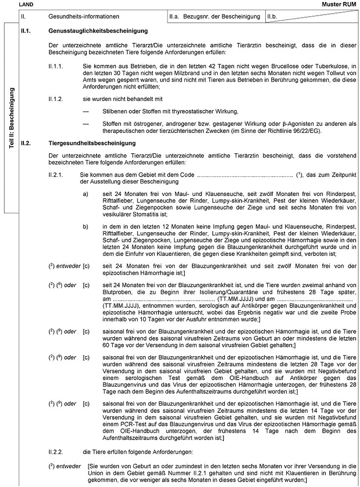 | " RUM-A": Musterveterinärbescheinigung für Tiere der nachstehend aufgeführten Arten, die aus einer amtlich zugelassenen Einrichtung, einem amtlich zugelassenen Institut oder einem amtlich zugelassenen Zentrum stammen und für eine solche bzw. ein solches bestimmt sind | ||