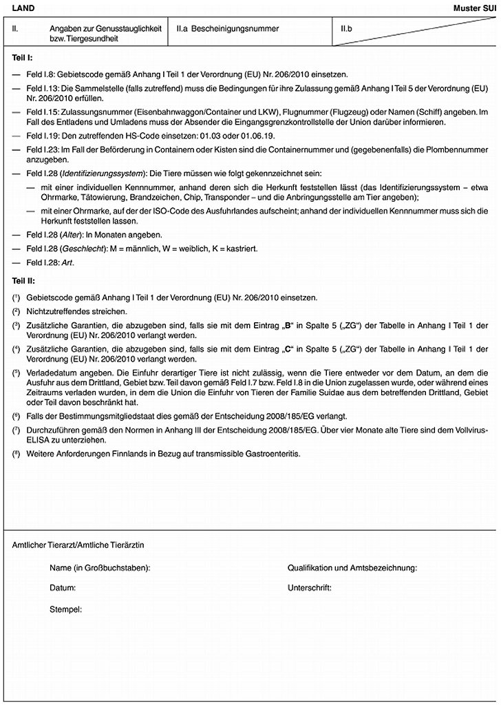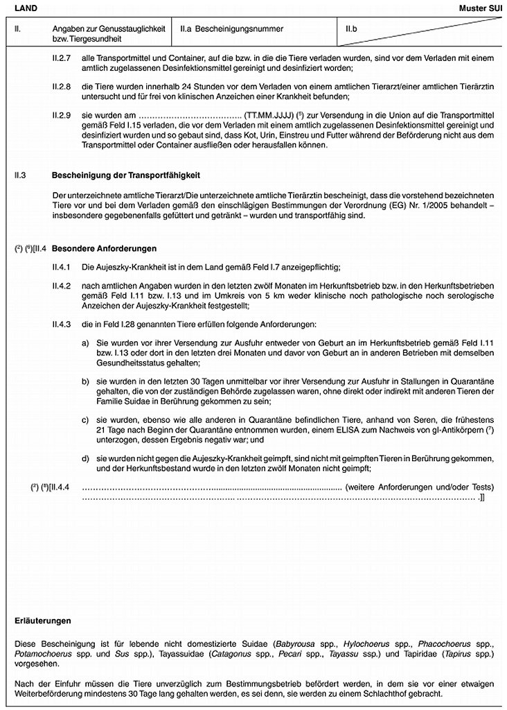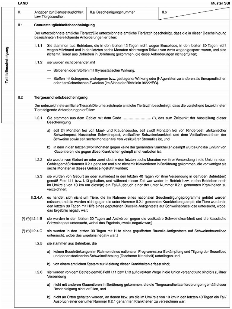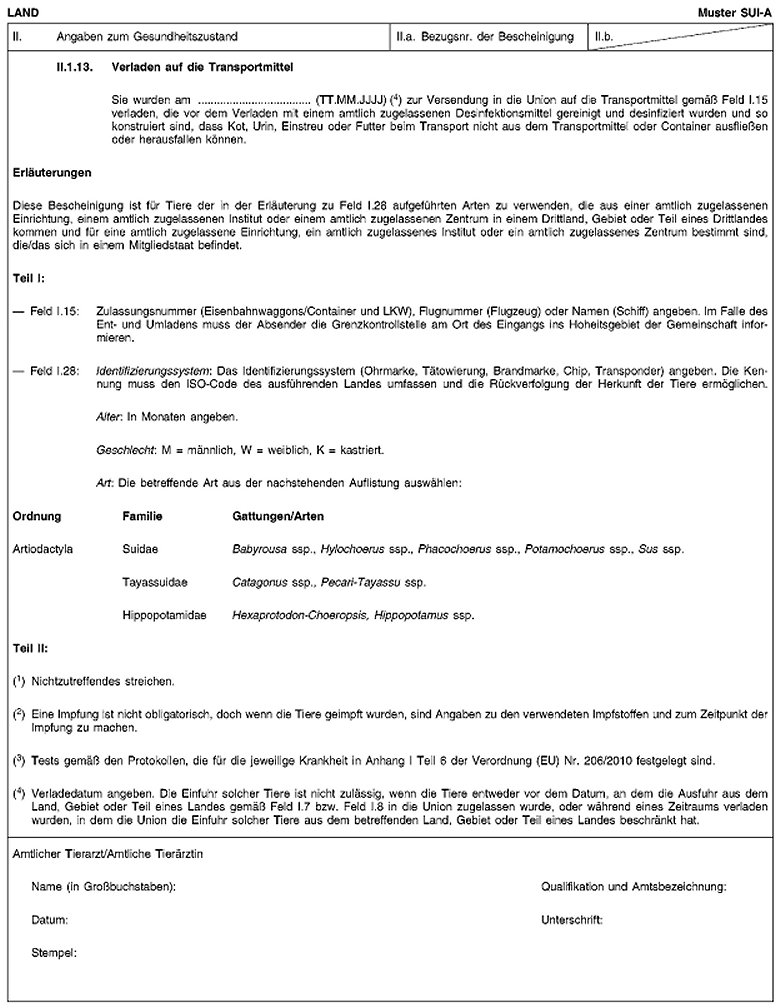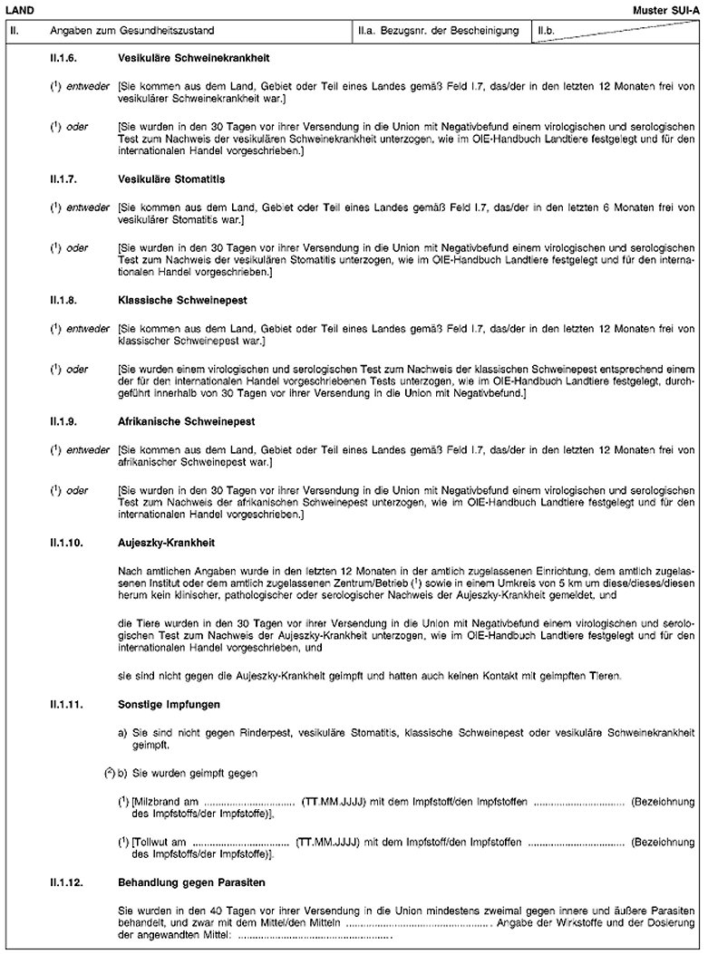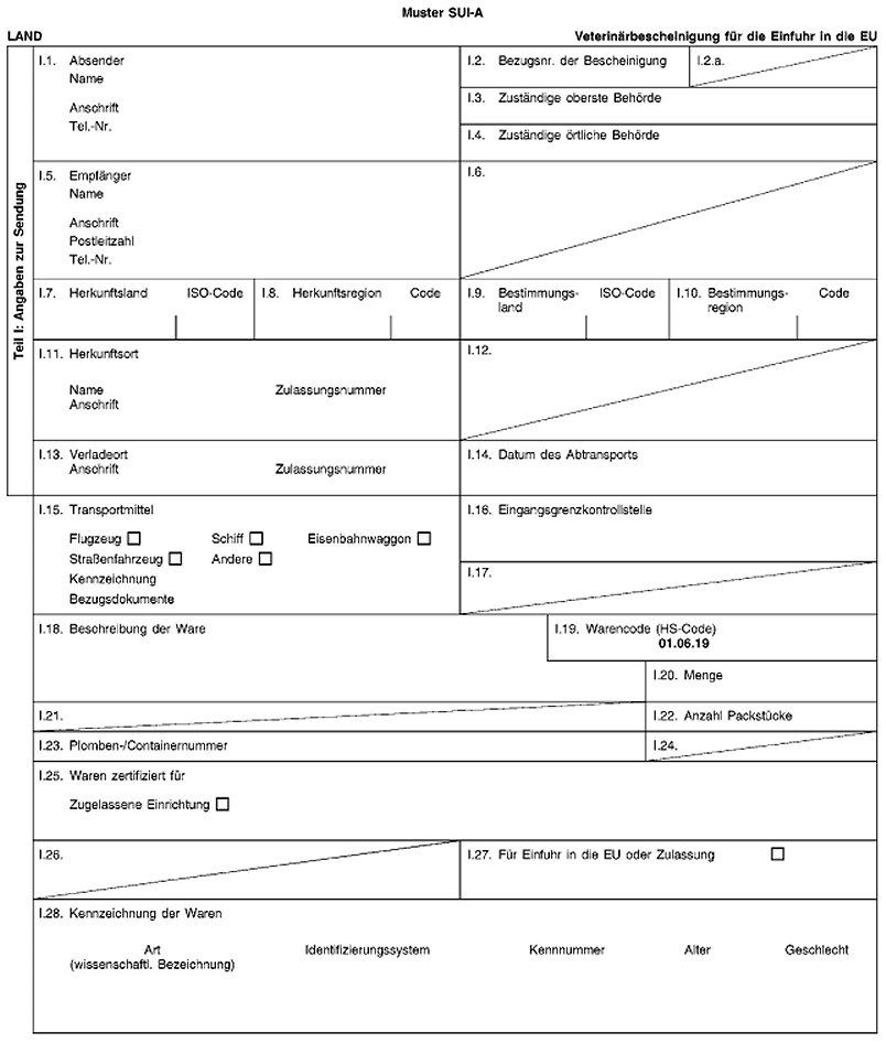 | " SUI-A": Musterveterinärbescheinigung für Tiere der nachstehend aufgeführten Arten, die aus einer amtlich zugelassenen Einrichtung, einem amtlich zugelassenen Institut oder einem amtlich zugelassenen Zentrum stammen und für eine solche bzw. ein solches bestimmt sind | |||