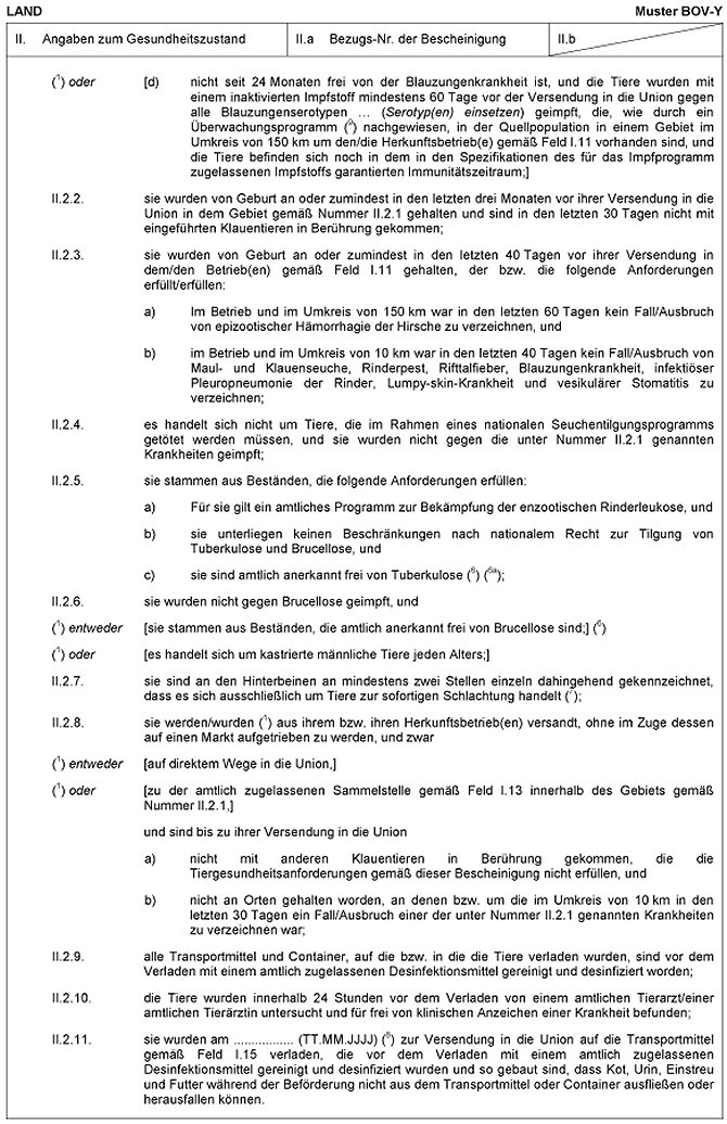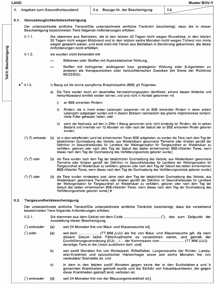 | "E": | Garantien hinsichtlich der Untersuchung der Tiere, aus denen frisches Fleisch gewonnen wurde, auf Tuberkulose, für die eine Bescheinigung nach dem Muster BOV (Nummer II.2.4 Buchstabe d) ausgestellt wurde |