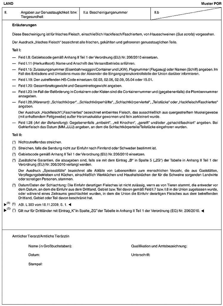 | " POR": | Veterinärbescheinigung für frisches Fleisch, einschließlich Hackfleisch/Faschiertem, von Hausschweinen (Sus scrofa) |