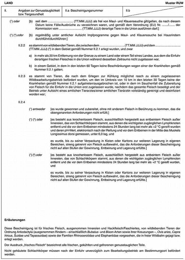 | " RUW": | Veterinärbescheinigung für frisches Fleisch, ausgenommen Innereien und Hackfleisch/Faschiertes, von Wild der Ordnung Artiodactyla (ausgenommen Rindern, - einschließlich Bison und Bubalus-Arten sowie ihrer Kreuzungen -, Ovis aries, Capra hircus, Suidae und Tayassuidae) sowie der Familien Rhinocerotidae und Elephantidae |