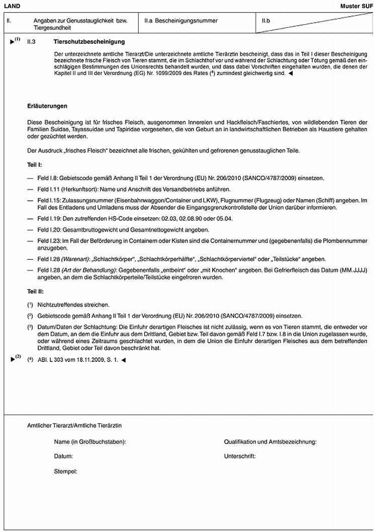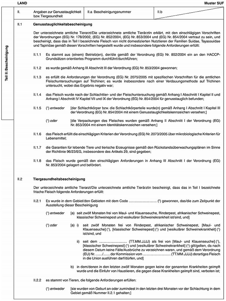 | " SUF": | Veterinärbescheinigung für frisches Fleisch, ausgenommen Innereien und Hackfleisch/Faschiertes, von Gatterwild der Familien Suidae, Tayassuidae und Tapiridae |