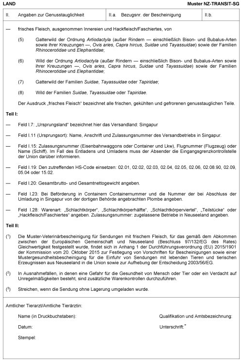 | " NZ-TRANSIT-SG" | Veterinärbescheinigung nur für die Durchfuhr frischen Fleisches mit Ursprung in Neuseeland, das von Neuseeland in die Union verbracht werden darf und für die Union bestimmt ist, durch Singapur mit Entladen, möglicher Lagerung und Umladen. |