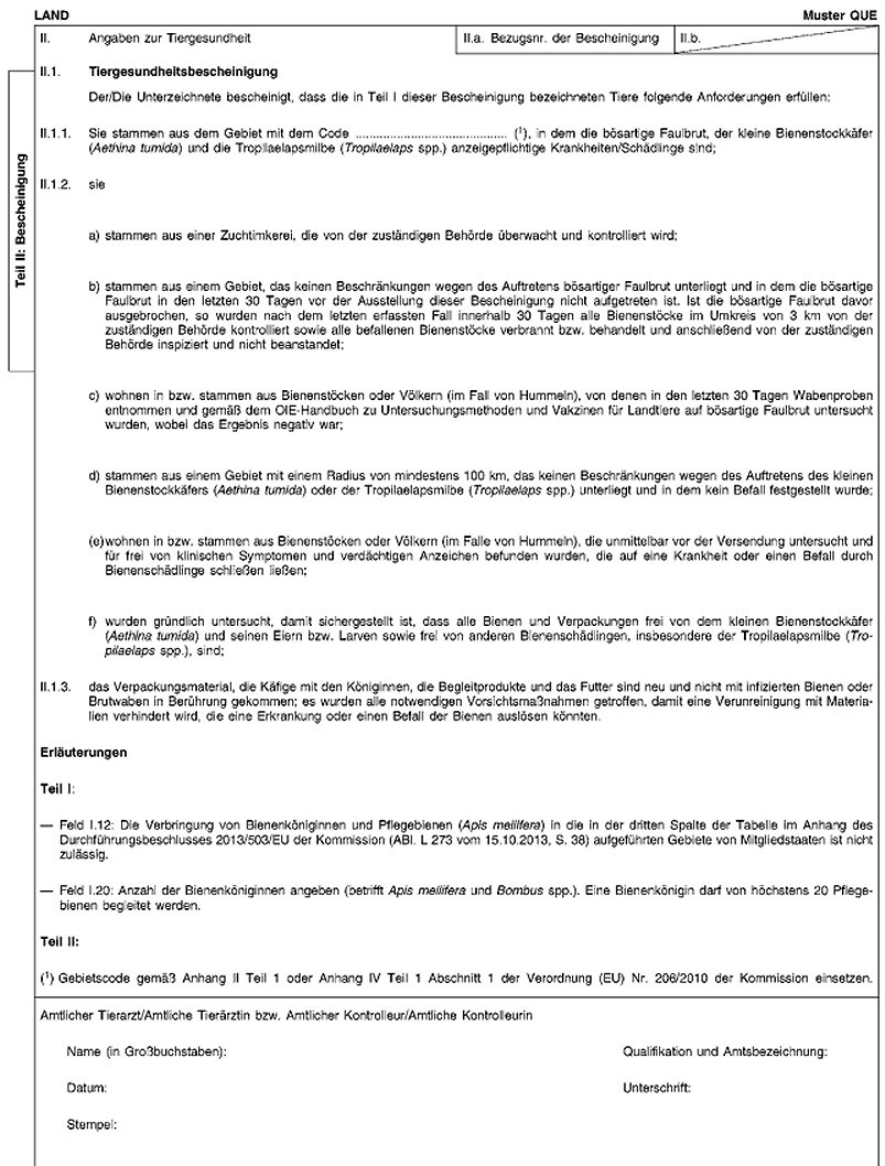 | "QUE" Veterinärbescheinigung für Sendungen mit Bienenköniginnen und Hummelköniginnen (Apis mellifera bzw. Bombus spp.)