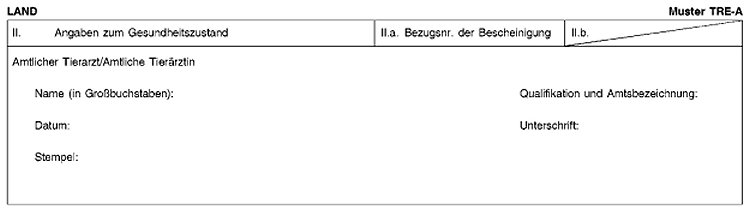 | " TRE-A": Musterveterinärbescheinigung für Tiere der nachstehend aufgeführten Arten, die aus einer amtlich zugelassenen Einrichtung, einem amtlich zugelassenen Institut oder einem amtlich zugelassenen Zentrum stammen und für eine solche bzw. ein solches bestimmt sind | |||