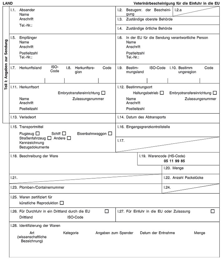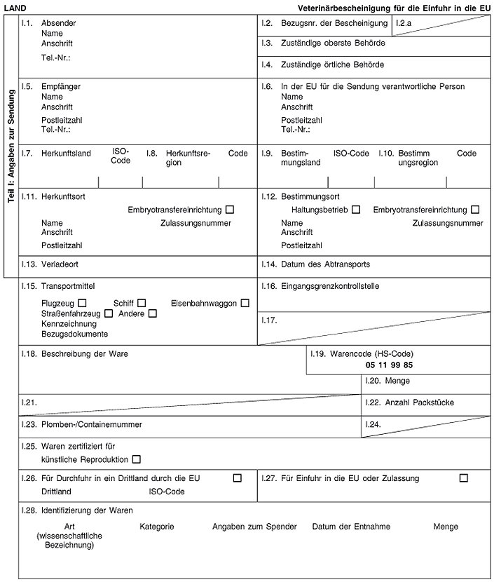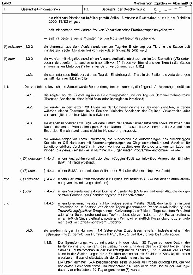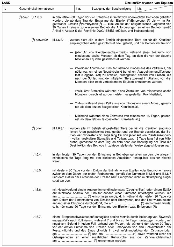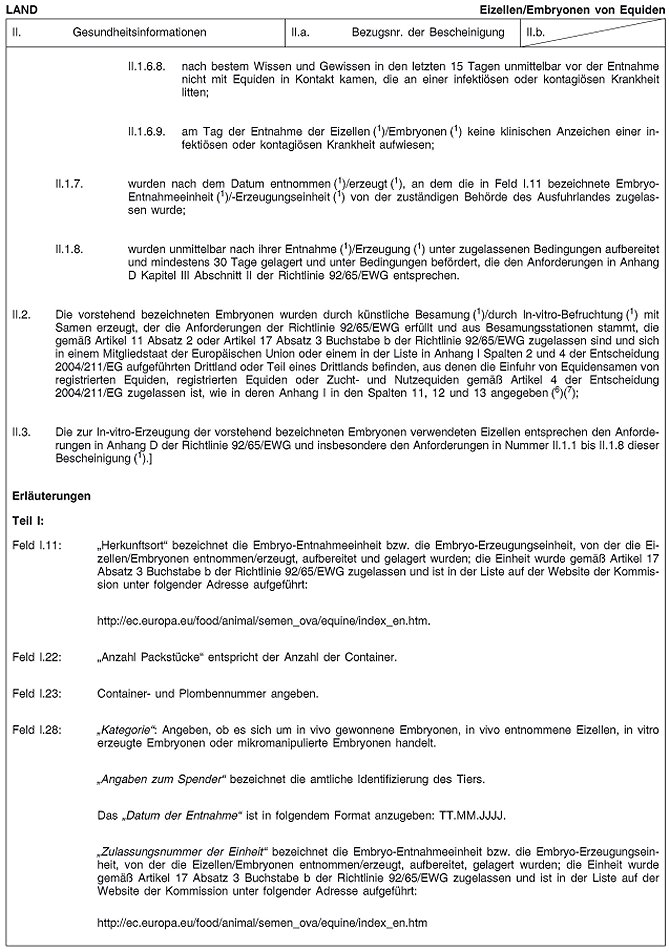 | Musterveterinärbescheinigung für die Einfuhr von Eizellen und Embryonen von Equiden | Anhang II 15 |