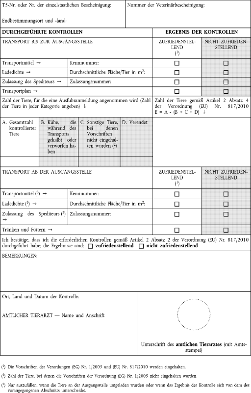 (3) Stellt der amtliche Tierarzt an der Ausgangsstelle fest, dass die Voraussetzungen von Absatz 2 erfüllt sind, so bestätigt er dies durch einen der in Anhang II aufgeführten Vermerke und durch seinen Stempel und seine Unterschrift im Dokument über das Verlassen des Zollgebiets der Gemeinschaft entweder in Feld J des Kontrollexemplars T5 oder an geeigneter Stelle in der einzelstaatlichen Bescheinigung.