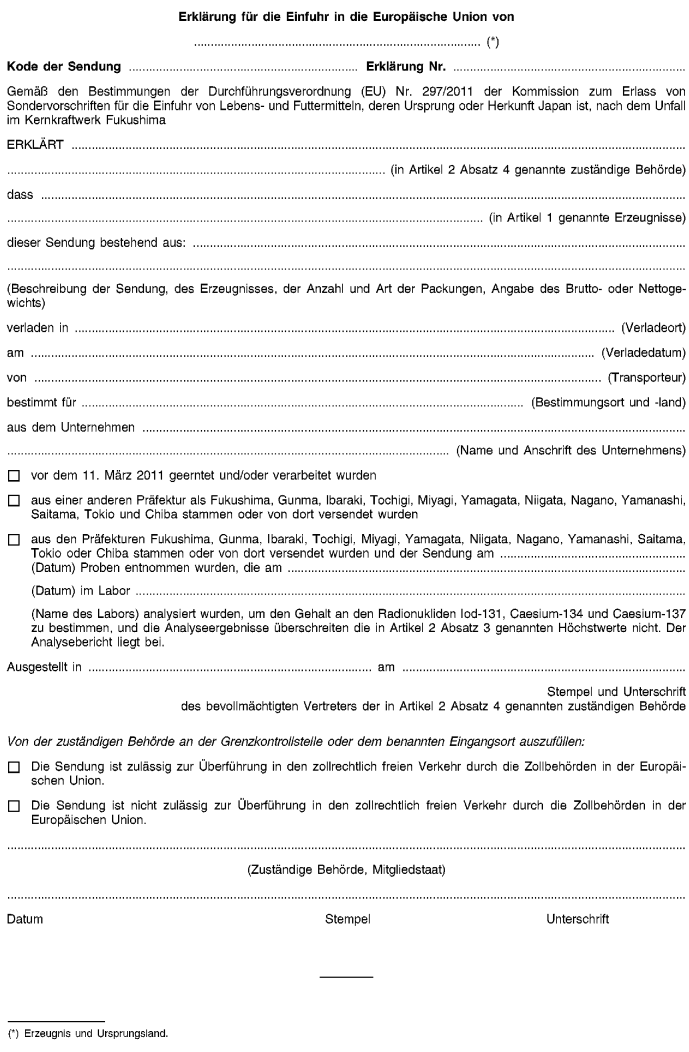 (2) Nach dem Unfall im Kernkraftwerk Fukushima am 11. März 2011 wurde die Kommission darüber unterrichtet, dass die Radionuklidgehalte bestimmter aus Japan stammender Lebensmittelerzeugnisse, wie Milch und Spinat, die in Japan für Lebensmittel geltenden Grenzwerte überschreiten. Eine solche Kontamination kann eine Bedrohung für die öffentliche Gesundheit und die Tiergesundheit in der Union darstellen; deshalb erließ die Kommission am 25. März 2011 die Durchführungsverordnung (EU) Nr. 297/2011 zum Erlass von Sondervorschriften für die Einfuhr von Lebens- und Futtermitteln, deren Ursprung oder Herkunft Japan ist, nach dem Unfall im Kernkraftwerk Fukushima. 2