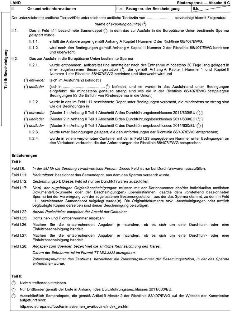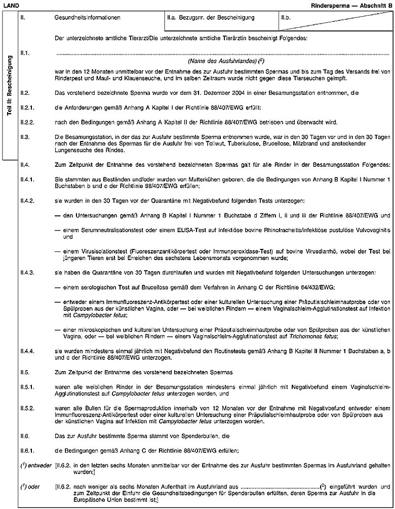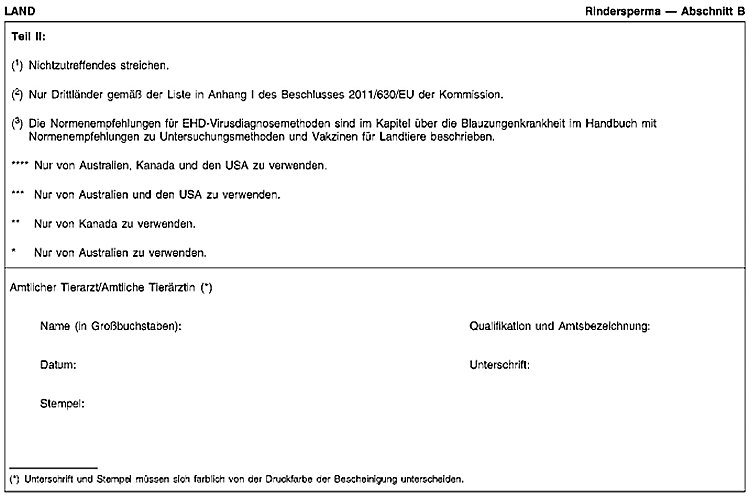 *) Die Musterbescheinigung für Einfuhren aus Kanada findet sich in der Entscheidung 2005/290/EG der Kommission vom 4. April 2005 über vereinfachte Veterinärbescheinigungen für die Einfuhr von Rindersperma und frischem Schweinefleisch aus Kanada sowie zur Änderung der Entscheidung 2004/639/EG (nur für in Kanada entnommenes Sperma) und entspricht dem Abkommen zwischen der Europäischen Gemeinschaft und der Regierung Kanadas über gesundheitspolizeiliche Maßnahmen zum Schutz der Gesundheit von Mensch und Tier im Handel mit lebenden Tieren und Tierprodukten, das durch den Beschluss 1999/201/EG des Rates genehmigt wurde. **) Die Musterbescheinigungen für Einfuhren aus der Schweiz finden sich im Anhang D der Richtlinie 88/407/EWG des Rates, mit den entsprechenden Änderungen gemäß Anhang 11 Anlage 2 Kapitel VII Abschnitt B Nummer 4 des Abkommens zwischen der Europäischen Gemeinschaft und der Schweizerischen Eidgenossenschaft über den Handel mit landwirtschaftlichen Erzeugnissen, das durch den Beschluss 2002/309/EG , Euratom des Rates und - bezüglich des Abkommens über die wissenschaftliche und technische Zusammenarbeit - der Kommission vom 4. April 2002 über den Abschluss von sieben Abkommen mit der Schweizerischen Eidgenossenschaft genehmigt wurde. ***) Für die Zwecke der Einfuhr von Rindersperma in die Union gilt, dass der Rindertuberkulosestatus eines entsprechend der neuseeländischen Seuchenbekämpfungsstrategie bezüglich der Rindertuberkulose als "C2" eingestuften Rinderbestands dem Rindertuberkulosestatus eines Rinderbestands gleichwertig ist, der in einem Mitgliedstaat gemäß Anhang a Abschnitt I Nummern 1 und 2 der Richtlinie 64/432/EWG als ,amtlich anerkannt tuberkulosefreier Rinderbestand" eingestuft ist. |