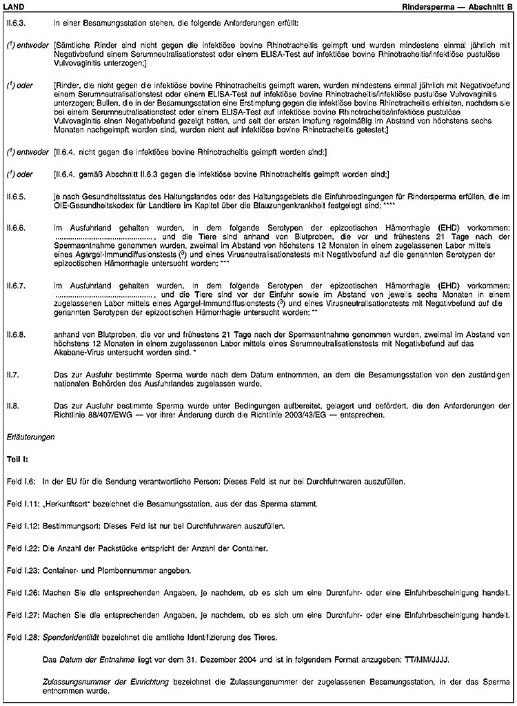 Muster 2 - Ab 1. Januar 2005 geltende Veterinärbescheinigung für die Einfuhr und die Durchfuhr von Beständen an Rindersperma, das vor dem 31. Dezember 2004 gemäß den bis zum 1. Juli 2004 geltenden Bestimmungen der Richtlinie 88/407/EWG des Rates entnommen, aufbereitet und gelagert wurde, nach dem 31. Dezember 2004 gemäß Artikel 2 Absatz 2 der Richtlinie 2003/43/EG eingeführt und aus der Besamungsstation verbracht wird, in der es entnommen wurde