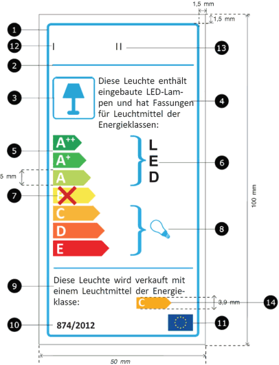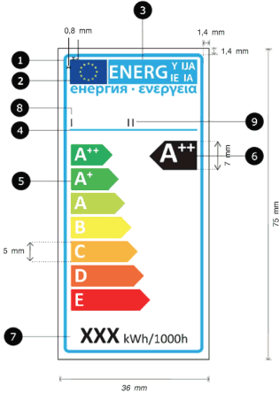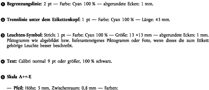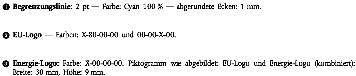 Die in den Nummern 1 und 2 angegebene Version des Etiketts muss mindestens 36 mm breit und 75 mm hoch sein, und die in Nummer 3 angegebenen Versionen müssen mindestens 36 mm breit und 68 mm hoch bzw. mindestens 36 mm breit und 62 mm hoch sein. Wenn die Verpackung nicht genügend Platz für das Etikett und dessen Rand bietet oder dadurch mehr als 50 % der Oberfläche der größten Seite eingenommen würde, können das Etikett und der Rand so lange verkleinert werden, wie beide Voraussetzungen erfüllt bleiben. Das Etikett darf jedoch in keinem Fall auf weniger als 40 % seiner Standardgröße (der Höhe nach) verkleinert werden. Ist die Verpackung für ein solches verkleinertes Etikett zu klein, muss ein 36 mm breites und 75 mm hohes Etikett an der Lampe oder der Verpackung befestigt werden.