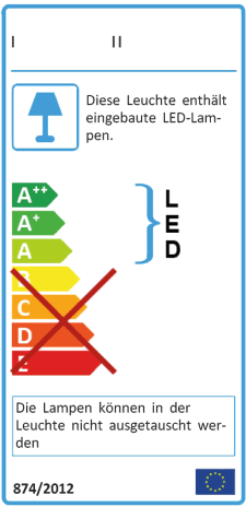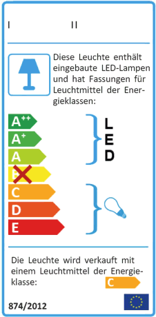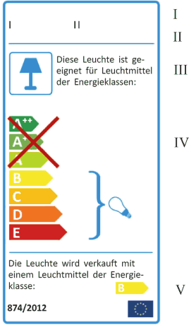 - einem Kreuz durch die Energieeffizienzklassen von Lampen, mit denen die Leuchte gemäß den Anforderungen an die Kompatibilität nach dem Stand der Technik nicht kompatibel ist,
