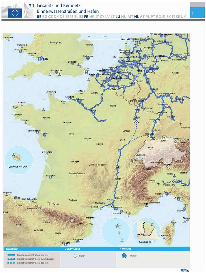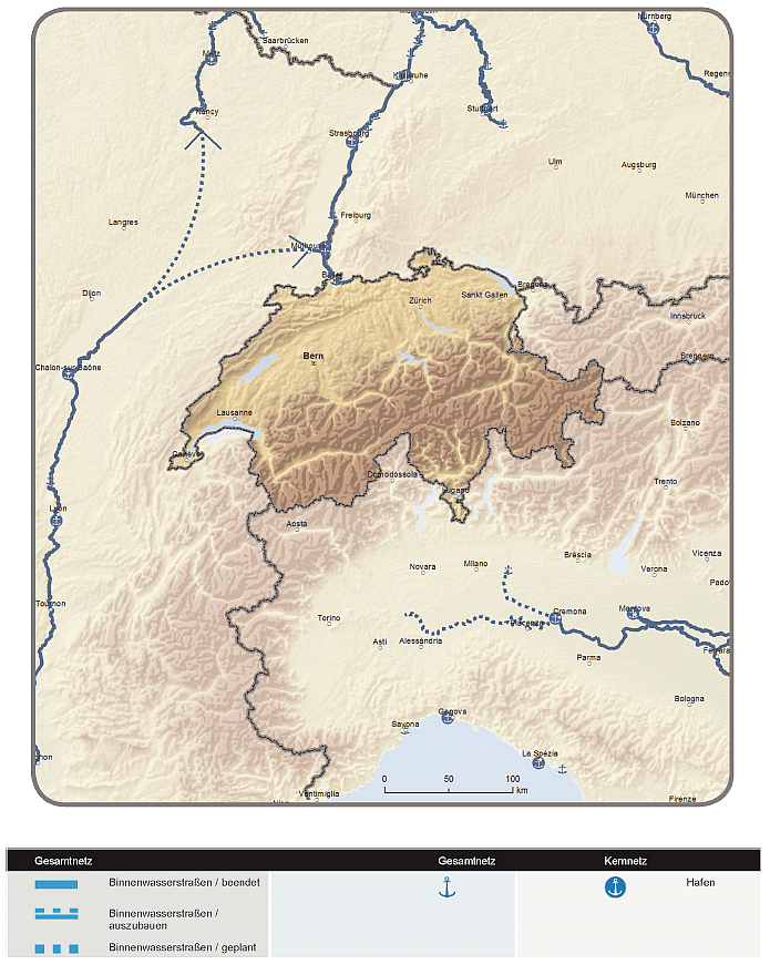 12.1. Indikative Ausdehnung auf Nachbarländer Gesamt- und Kernnetz: Binnenwasserstraßen und -häfen Schweiz / Suisse / Svizzera / Svizra - Liechtenstein |