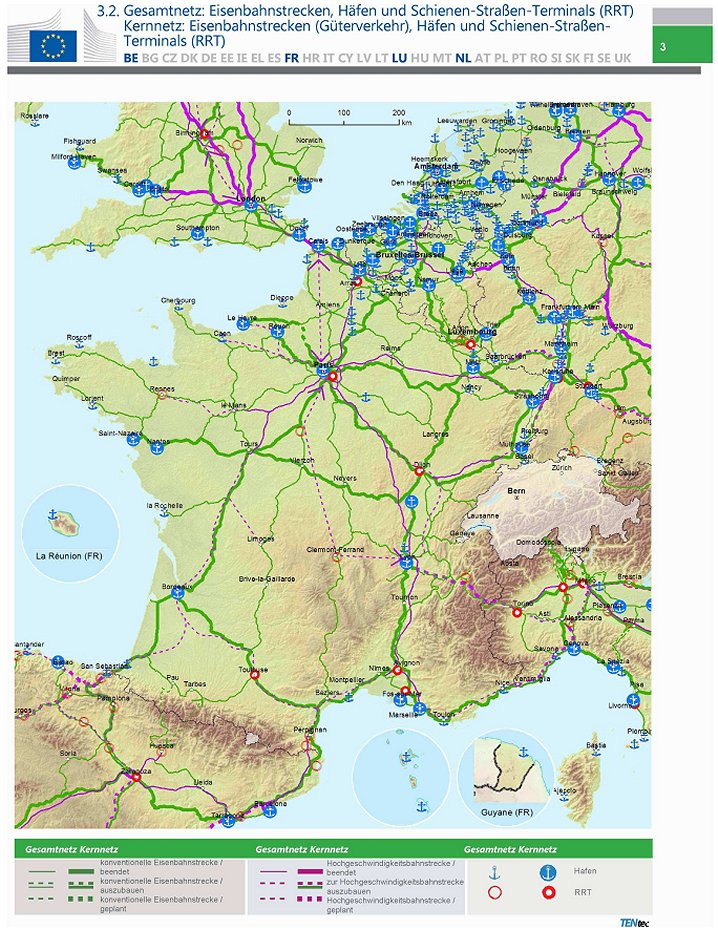 (27) Zur Festlegung der vorhandenen und geplanten Verkehrsinfrastrukturen für das Gesamtnetz und das Kernnetz sollten Karten erstellt und entsprechend der Entwicklung der Verkehrsströme fortlaufend angepasst werden. Die technische Grundlage für die Karten bildet das interaktive geografische und technische Informationssystem für das transeuropäische Verkehrsnetz (TENtec), das die Infrastruktur des transeuropäischen Verkehrsnetzes in einem höheren Detailgrad abbildet.