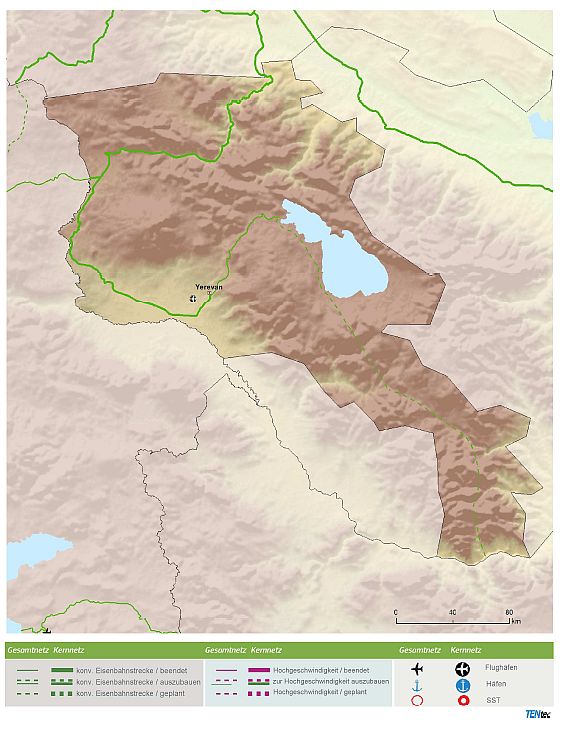 15.3. Indikative Karten des Kernnetzes in der Republik Armenien, Eisenbahnen Gesamtnetz: Eisenbahnstrecken, Häfen, Schienen-Straßen-Terminals und Flughäfen Kernnetz: Eisenbahnstrecken, Häfen, Schienen-Straßen-Terminals und Flughäfen Verkehrsnetz Östliche Partnerschaft: Republik Armenien |