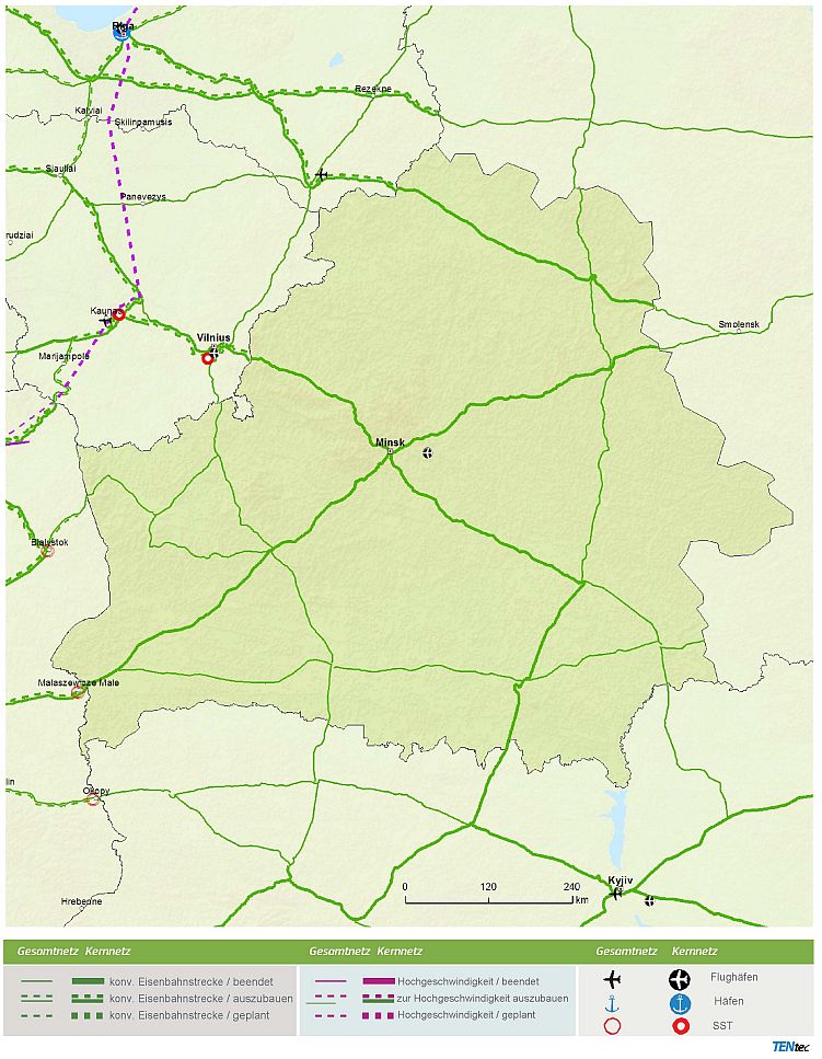 16.3. Indikative Karten des Kernnetzes in Belarus, Eisenbahnen Gesamtnetz: Eisenbahnstrecken, Häfen, Schienen-Straßen-Terminals und Flughäfen Kernnetz: Eisenbahnstrecken, Häfen, Schienen-Straßen-Terminals und Flughäfen Verkehrsnetz Östliche Partnerschaft: Belarus |