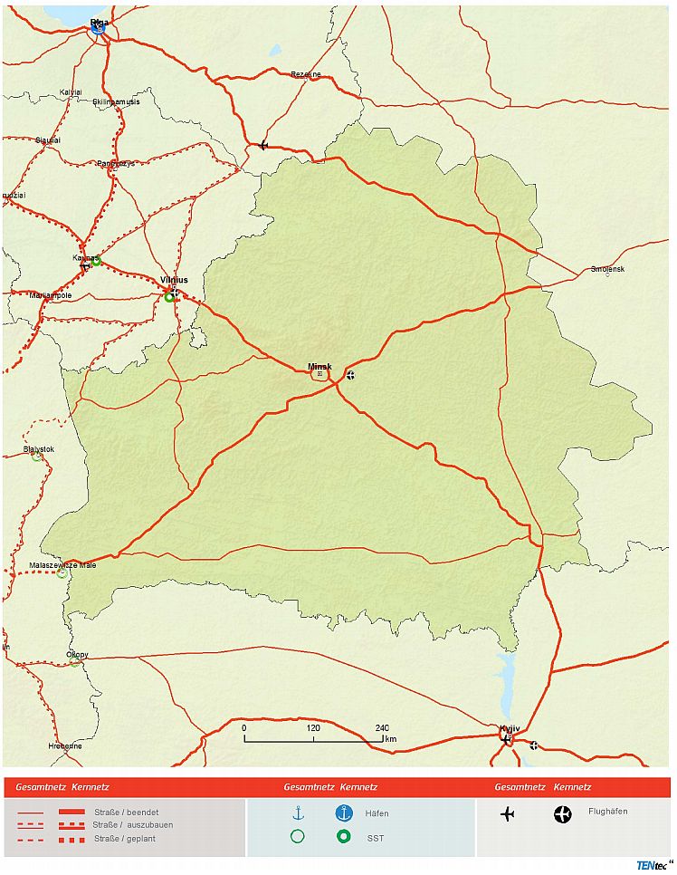 16.4. Indikative Karten des Kernnetzes in Belarus, Straßen Gesamtnetz und Kernnetz: Straßen, Häfen, Schienen-Straßen-Terminals und Flughäfen Verkehrsnetz Östliche Partnerschaft: Belarus |
