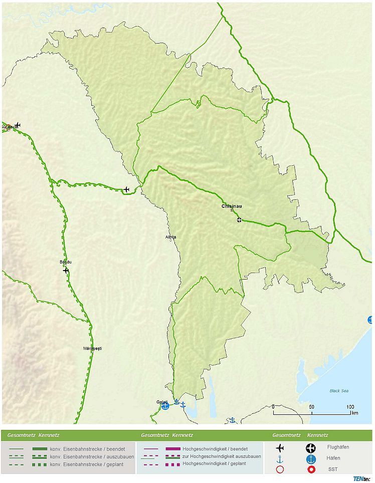 16.5. Indikative Karten des Kernnetzes in der Republik Moldau, Eisenbahnen Gesamtnetz: Eisenbahnstrecken, Häfen, Schienen-Straßen-Terminals und Flughäfen Kernnetz: Eisenbahnstrecken, Häfen, Schienen-Straßen-Terminals und Flughäfen Verkehrsnetz Östliche Partnerschaft: Republik Moldau |