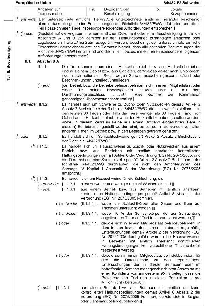 2) Durchführungsbeschluss 2014/798/EU der Kommission vom 13. November 2014 über die Änderung von Anhang F der Richtlinie 64/432/EWG des Rates im Hinblick auf das Format der Mustergesundheitsbescheinigungen für den Handel mit Rindern und Schweinen innerhalb der Union und auf die zusätzlichen Gesundheitsanforderungen bezüglich Trichinen beim Handel mit Hausschweinen innerhalb der Union (ABl. Nr. L 330 vom 15.11.2014 S. 50).