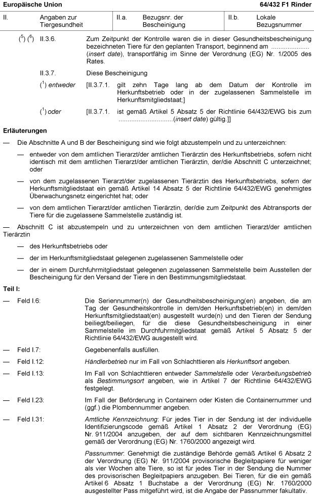 3) Verordnung (EG) Nr. 599/2004 der Kommission vom 30. März 2004 zur Festlegung einheitlicher Musterbescheinigungen und Kontrollberichte für den innergemeinschaftlichen Handel mit Tieren und Erzeugnissen tierischen Ursprungs (ABl. Nr. L 94 vom 31.03.2004 S. 44).