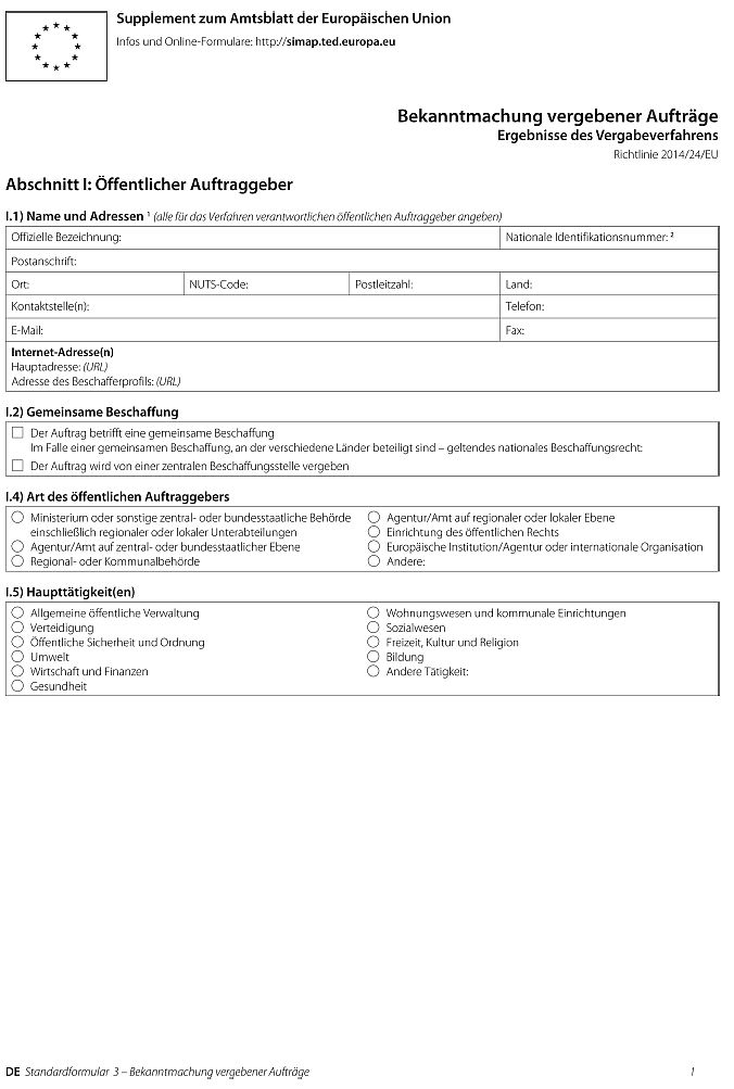 | Standardformular 3: "Bekanntmachung vergebener Aufträge" | Anhang III |
