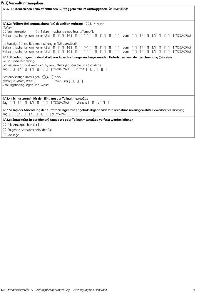 | Standardformular 17: "Auftragsbekanntmachung - Verteidigung und Sicherheit" | Anhang XIV |