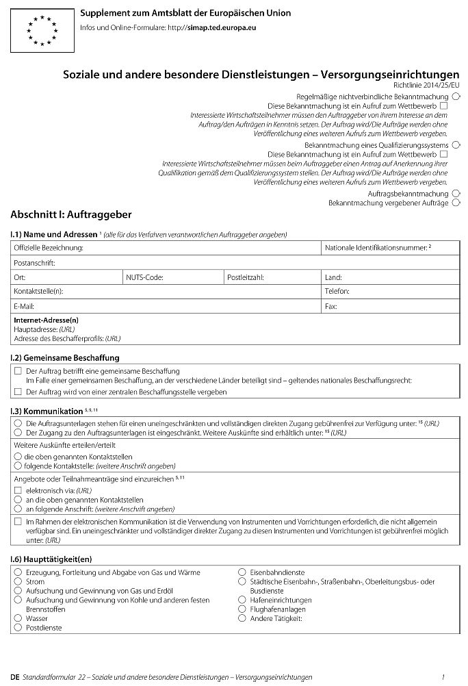 Standardformular 22: "Sozial- und andere besondere Dienstleistungen - Versorgungssektoren": Anhang XIX