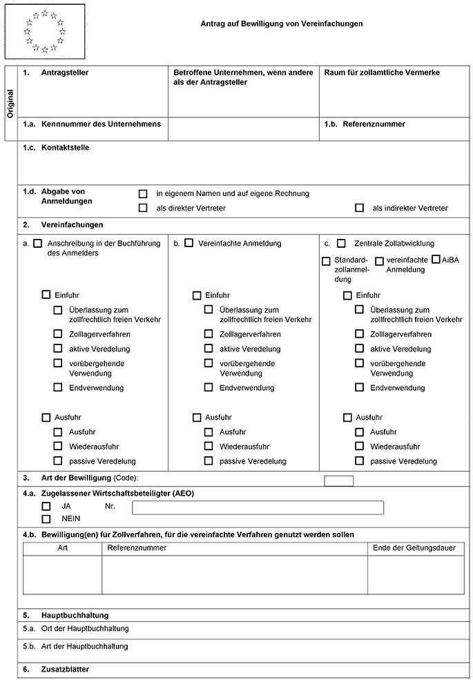 (1) Die Vordrucke "Antrag auf Bewilligung der vereinfachten Anmeldung und der Anschreibung in der Buchführung des Anmelders", "Antrag auf Bewilligung von Vereinfachungen, Zusatzblatt - EINFUHR" und "Erläuterungen zu den einzelnen Feldern des Antragsvordrucks" erhalten die Fassung der Vordrucke des Anhangs I der vorliegenden Verordnung.