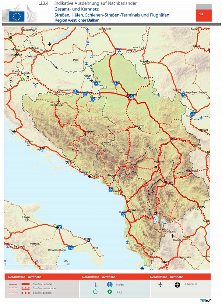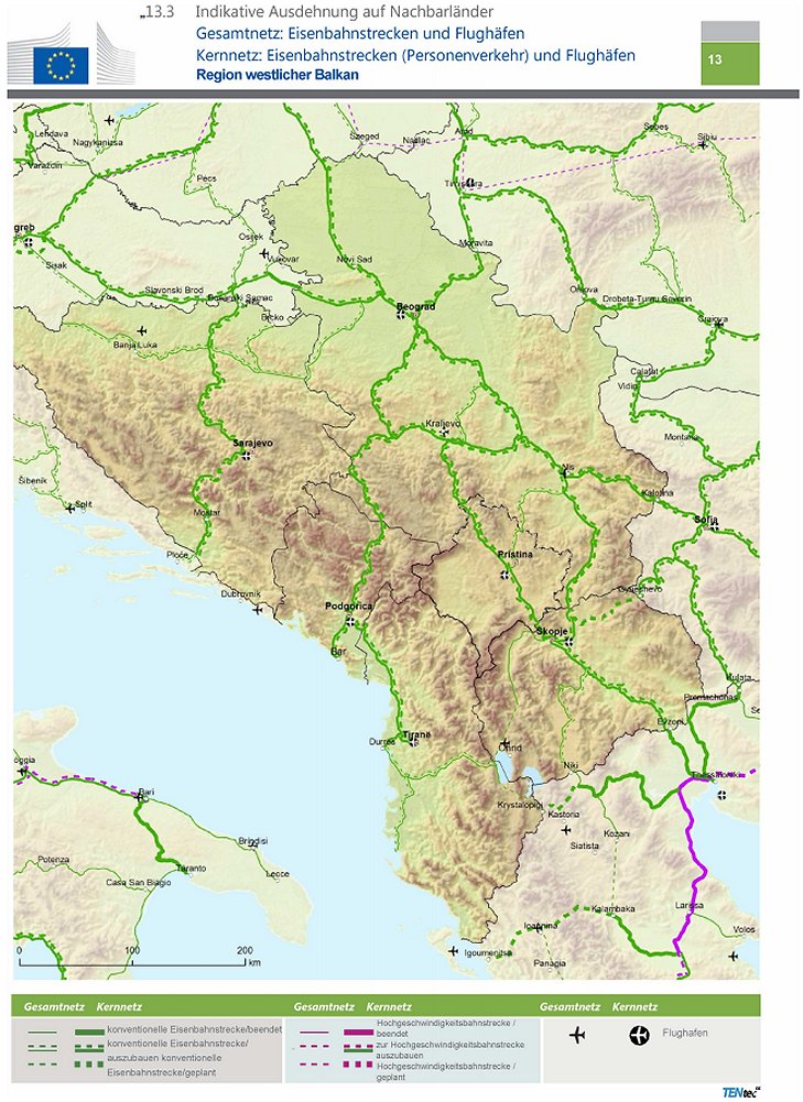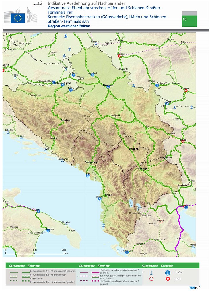 (2) Eine Vereinbarung auf hoher Ebene zwischen der Union und den westlichen Balkanländern Albanien, Bosnien und Herzegowina, dem Kosovo, der ehemaligen jugoslawischen Republik Mazedonien, Montenegro und Serbien wurde am 27. August 2015 auf dem "Westbalkan-Sechs"-Gipfel in Wien über die Anpassung der Karten über die indikative Ausdehnung des TEN-V-Gesamtnetzes sowie zur Bestimmung der Kernnetzverbindungen auf den Gesamtnetz-Karten gebilligt. Die Vereinbarung bezieht sich auf Strecken des Schienen- und des Straßennetzes sowie auf Häfen und Flughäfen. Die Anpassung der Karten des indikativen Gesamtnetzes und insbesondere die Bestimmung des indikativen Kernnetzes sollten es der Union ermöglichen, ihre Zusammenarbeit mit dem Westbalkan, auch in Bezug auf ihre finanzielle Unterstützung, gezielter auszurichten.