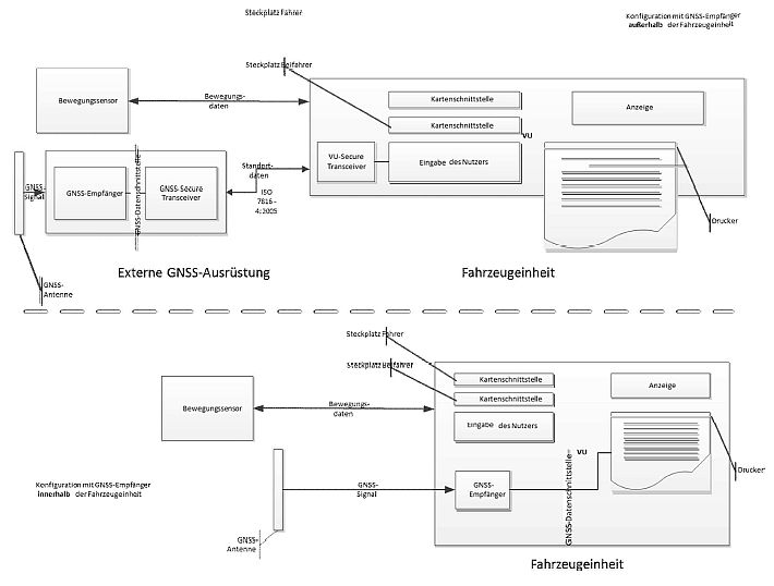 Die wichtigsten Artikel dieser Verordnung (EU) Nr. 165/2014, die diese Anforderungen regeln, sind: " Artikel 8 Aufzeichnung des Fahrzeugstandorts an bestimmten Punkten bzw. Zeitpunkten während der täglichen Arbeitszeit", "Artikel 10 Schnittstelle zu intelligenten Verkehrssystemen" und " Artikel 11 Einzelvorschriften für intelligente Fahrtenschreiber".
