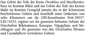 | Diejenigen Teile des Kreises Orosháza im Komitat Békés und diejenigen Teile des Kreises Makó im Komitat Csongrád, die innerhalb eines Umkreises von drei Kilometern um die GPS-Koordinaten N46.39057, E20.74251 liegen, ergänzt um die gesamten bebauten Gebiete der Ortschaften Tótkomlós und Nagyér. | 27.11.2016 | |||