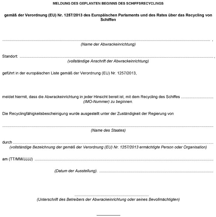 (3) Gemäß Artikel 3 Nummer 6 der Verordnung (EU) Nr. 1257/2013 bezeichnet der Ausdruck "Schiffsrecycling" den Vorgang des vollständigen oder teilweisen Demontierens eines Schiffes. Im Falle eines teilweisen Demontierens ist daher eine Meldung des geplanten Beginns des Schiffsrecyclings erforderlich. Das Muster der Meldung des geplanten Beginns des Schiffsrecyclings bezieht sich auf eine einzige Abwrackeinrichtung. Erfolgt das Demontieren ein und desselben Schiffes in mehreren Einrichtungen, so ist für jede an dem Prozess beteiligte Einrichtung eine gesonderte Meldung des geplanten Beginns des Schiffsrecyclings erforderlich.