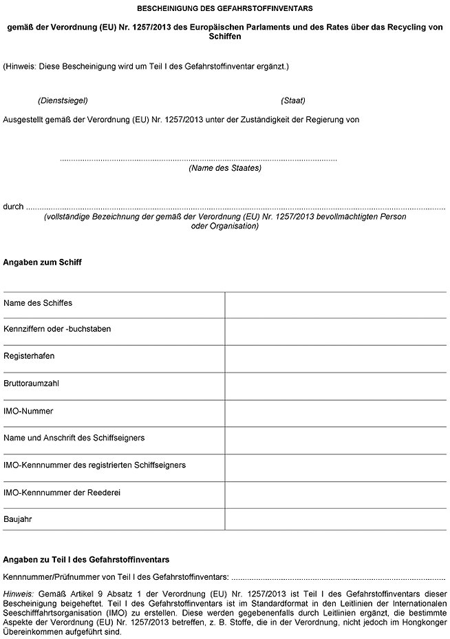 (2) Gemäß Artikel 5 der Verordnung (EU) Nr. 1257/2013 ist an Bord von Schiffen ein Gefahrstoffinventar mitzuführen.