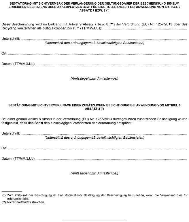 (5) Gemäß Artikel 9 Absatz 1 der Verordnung (EU) Nr. 1257/2013 muss die Verwaltung oder eine von ihr ermächtigte anerkannte Organisation nach erfolgreichem Abschluss einer erstmaligen oder einer Erneuerungsbesichtigung eine Inventarbescheinigung ausstellen. Das Muster der Inventarbescheinigung muss mit Anhang 3 des am 15. Mai 2009 in Hongkong angenommenen internationalen Übereinkommens über das sichere und umweltverträgliche Recycling von Schiffen (im Folgenden das "Hongkonger Übereinkommen") im Einklang stehen.