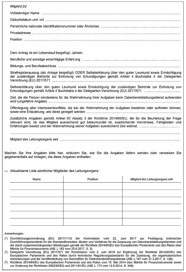 (3) Damit die zuständigen Behörden beurteilen können, ob Änderungen beim Leitungsorgan eines Datenbereitstellungsdienstes die effiziente, solide und umsichtige Führung dieses Datenbereitstellungsdienstes gefährden können, und damit sie dabei den Kundeninteressen und der Marktintegrität angemessen Rechnung tragen können, sollten für die Übermittlung von Angaben zu diesen Änderungen klare Fristen gesetzt werden.