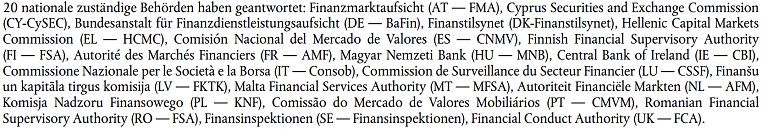 (9) Zudem haben sich die geltenden regulatorischen Anforderungen nach dem Unionsrecht nicht geändert und wenden die von der ESMa festgestellte Bedrohung nicht ab. Außerdem haben die nationalen zuständigen Behörden keine Maßnahmen ergriffen, um die Bedrohung abzuwenden, oder die ergriffenen Maßnahmen sind diesbezüglich unzureichend. Hier bleiben Bedenken auf gesamteuropäischer Ebene bestehen. Daher geht die ESMa davon aus, dass, wenn keine zusätzlichen nationalen zuständigen Behörden nationale Produktinterventionsmaßnahmen ergreifen, eine weitere Verlängerung der Maßnahme der ESMa erforderlich ist, um den in den Beschlüssen festgestellten erheblichen Bedenken hinsichtlich des Anlegerschutzes angemessen zu begegnen.