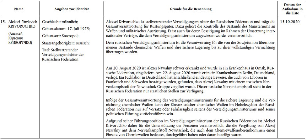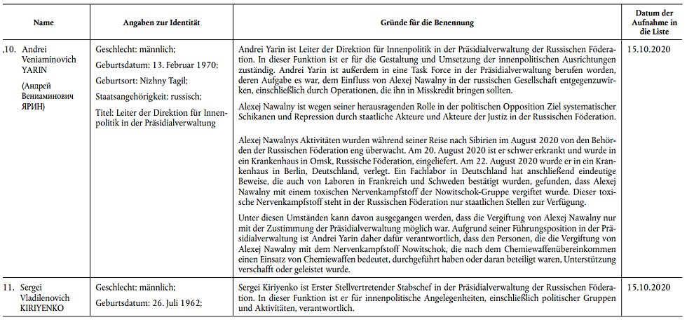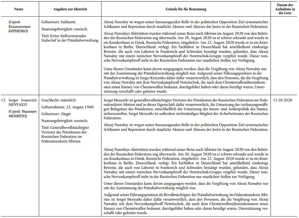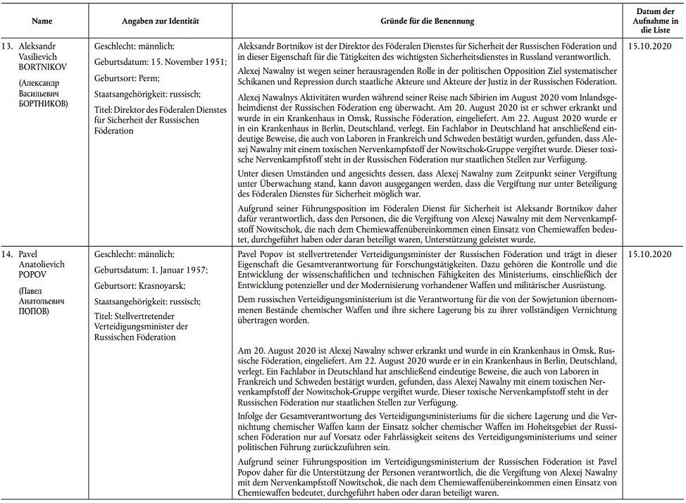 (4) Am 2. September 2020 gab die Regierung der Bundesrepublik Deutschland bekannt, dass ein spezialisiertes Labor der Bundeswehr Beweise dafür gefunden hatte, dass Alexej Nawalny mit einem toxischen Nervenkampfstoff der Nowitschok-Gruppe vergiftet worden war. Dieses Ergebnis wurde anschließend von Labors in Frankreich und Schweden bestätigt, was am 14. September 2020 bekannt gegeben wurde.