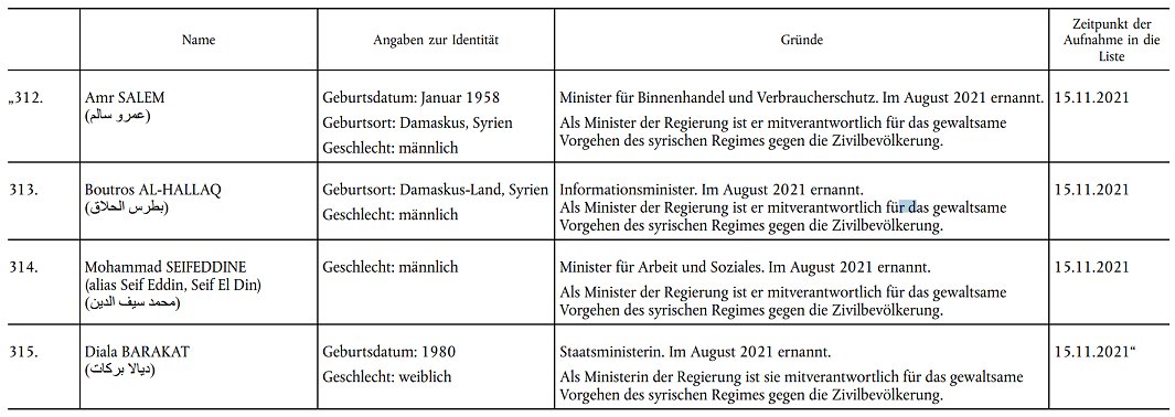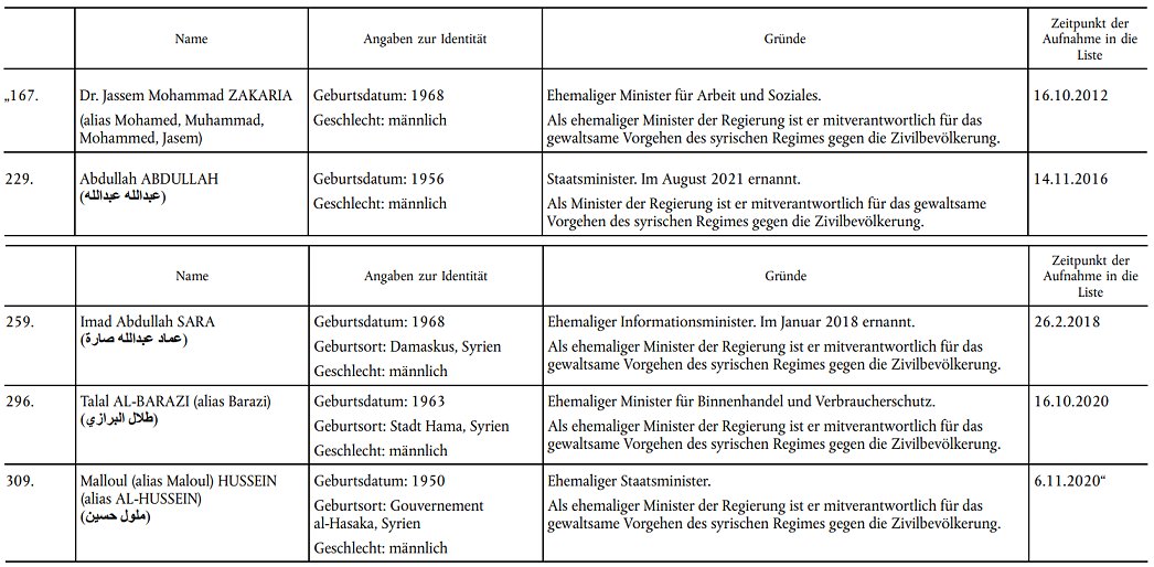 (2) Angesichts der sehr ernsten Lage in Syrien und in Anbetracht der jüngsten Veränderungen auf Ebene der syrischen Regierung sollten vier Personen in die Liste der natürlichen und juristischen Personen, Organisationen und Einrichtungen, die restriktiven Maßnahmen unterliegen, in Anhang I des Beschlusses 2013/255/GASP aufgenommen werden. Die Angaben zu fünf Personen, die bereits in Anhang I des Beschlusses 2013/255/GASP aufgelistet ist, sollten auf den neuesten Stand gebracht werden.