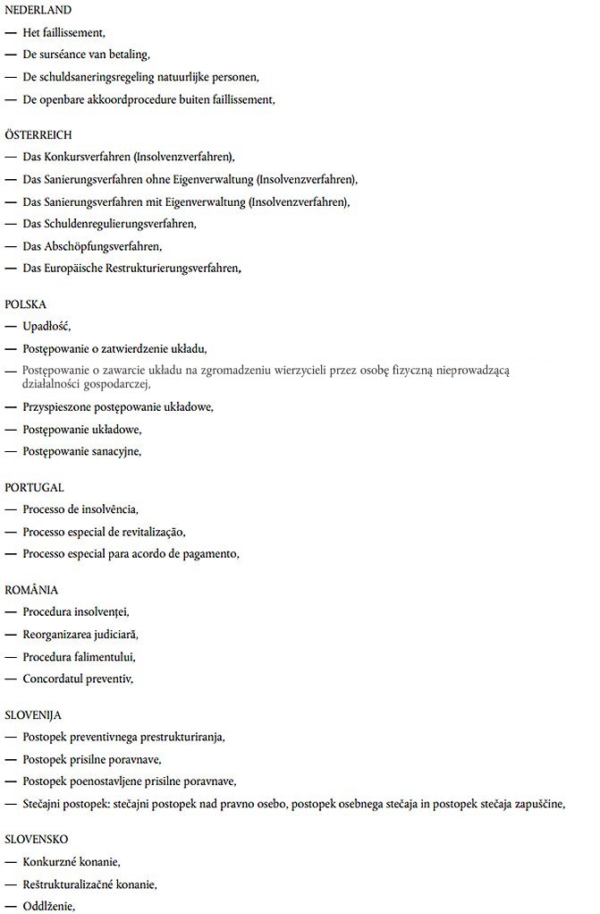 (1) In den Anhängen A und B der Verordnung (EU) 2015/848 des Europäischen Parlaments und des Rates 2 sind die von den Mitgliedstaaten mitgeteilten Bezeichnungen der nationalen Insolvenzverfahren bzw. der nationalen Verwalter aufgeführt, für die die genannte Verordnung gilt. In Anhang a sind für jeden Mitgliedstaat die Arten der Insolvenzverfahren gemäß Artikel 2 Nummer 4 der Verordnung (EU) 2015/848 aufgeführt und in Anhang B für jeden Mitgliedstaat die Arten der Verwalter gemäß Artikel 2 Nummer 5 der genannten Verordnung.