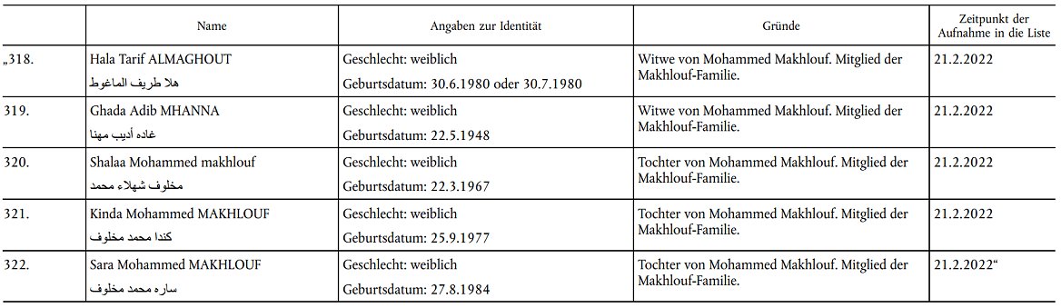 (3) Am 12. September 2020 verstarb Herr Mohammed Makhlouf. Da seine Erben alle Mitglieder der Familie Makhlouf sind, besteht ein inhärentes Risiko, dass die ererbten Vermögenswerte genutzt werden, um die Aktivitäten des syrischen Regimes zu unterstützen, und direkt in den Besitz des Regimes gelangen, dadurch möglicherweise zur gewaltsamen Unterdrückung der Zivilbevölkerung durch das Regime beitragen.